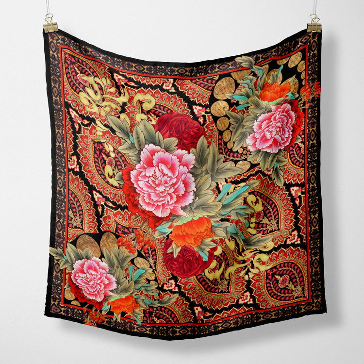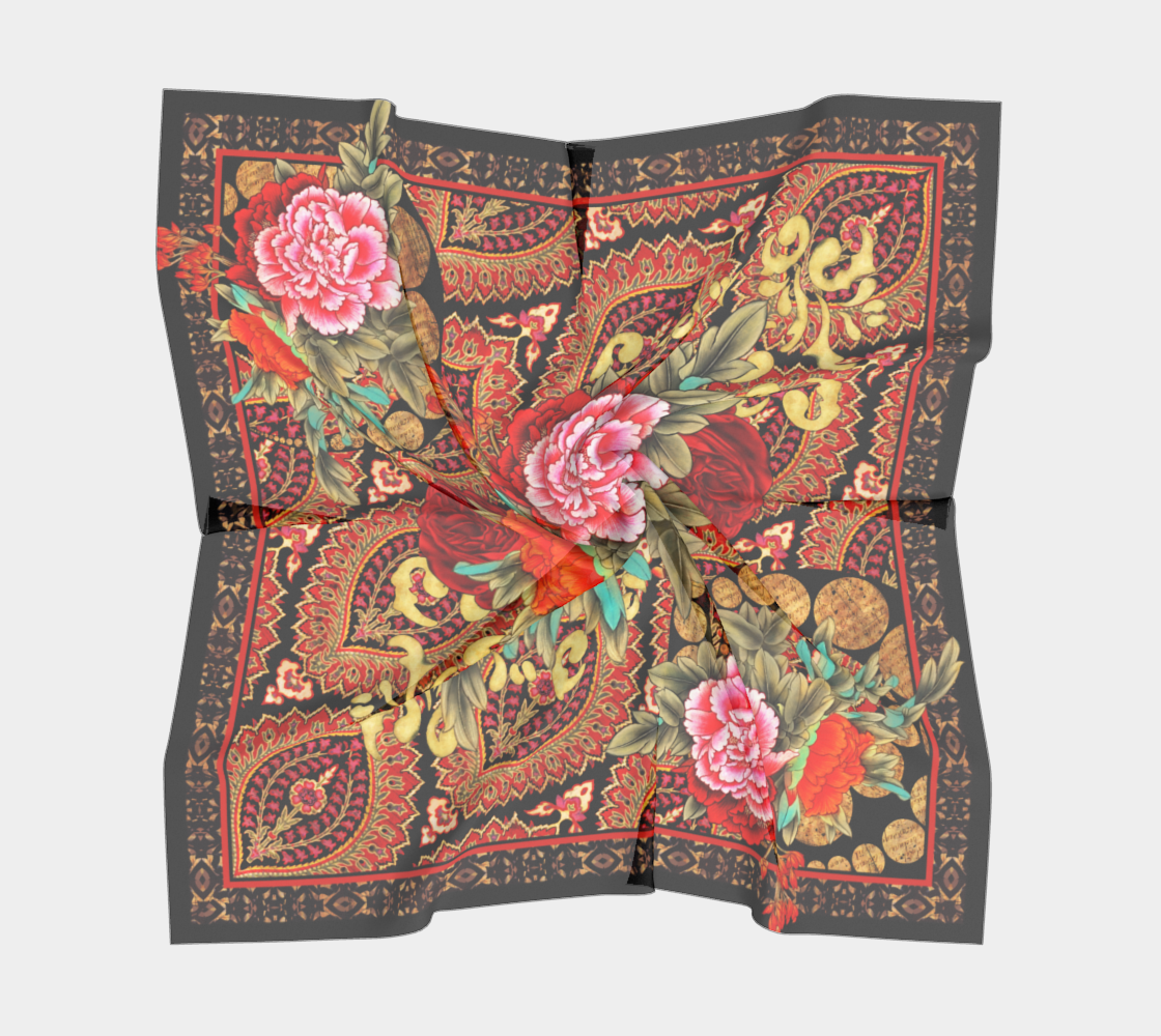 Unique one-of-a-kind, this scarf features a wearable version of one of my collages called “Marrakech Mystique”. The piece has a beautiful vibrant colour palette with captivating oversized florals and dramatic design elements that will add instant sizzle to any outfit.