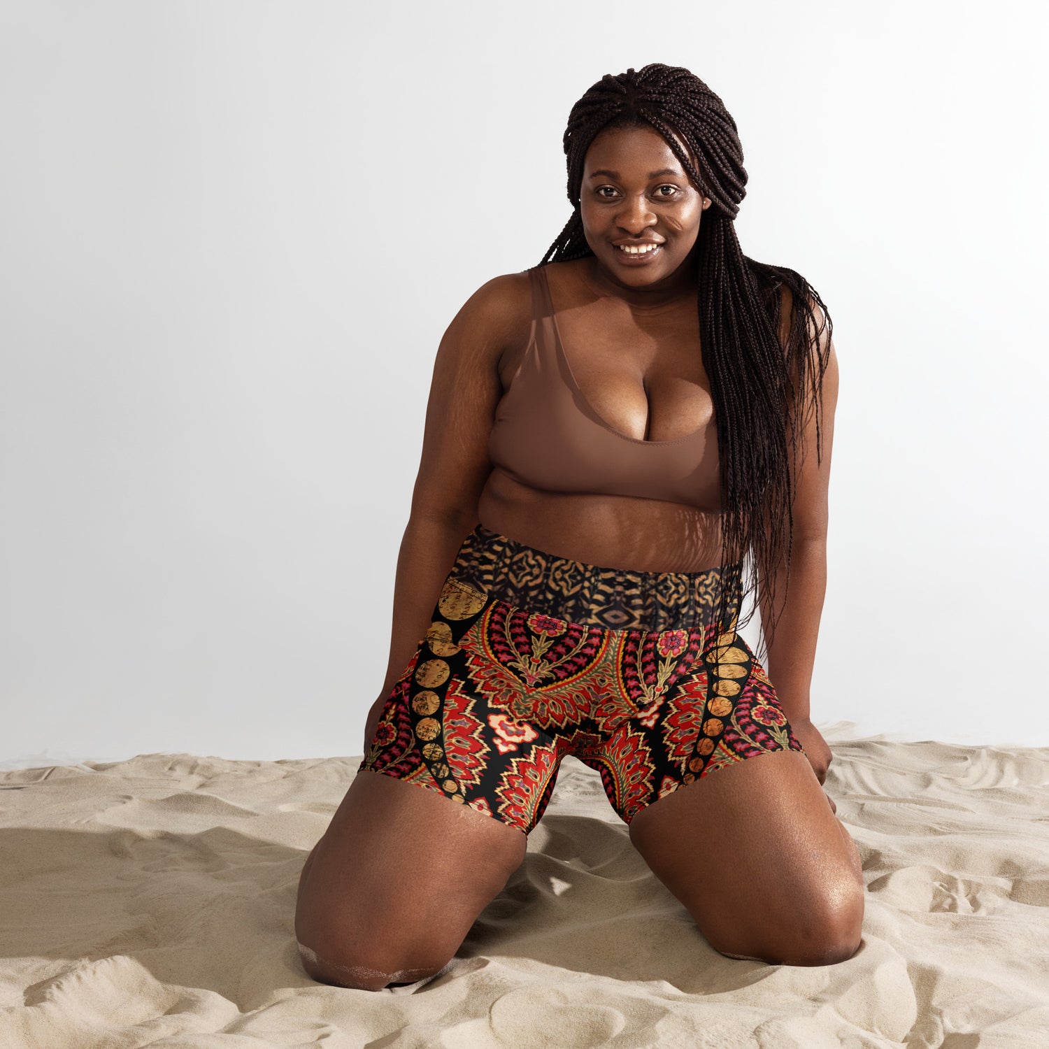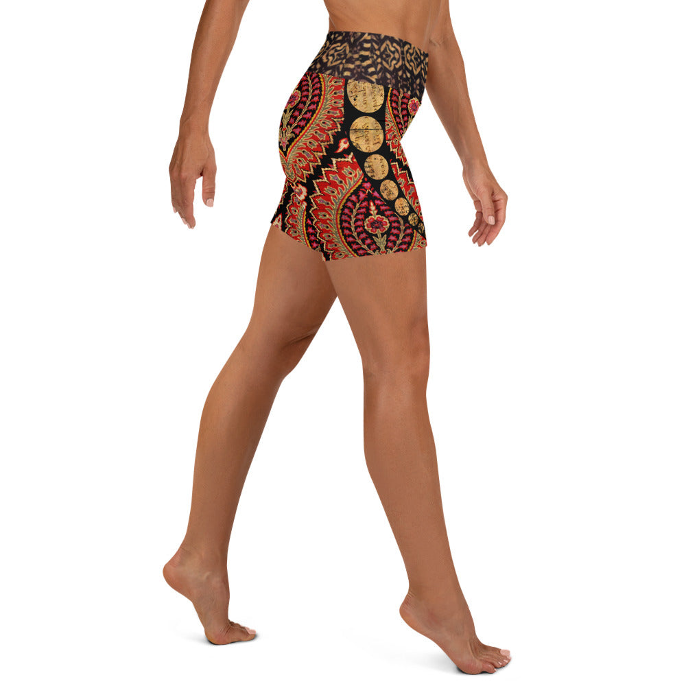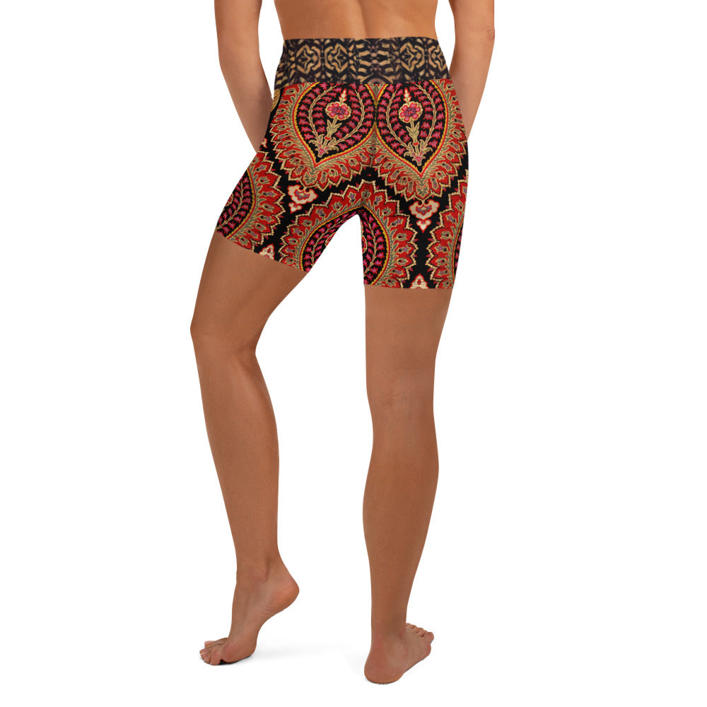 Crafted from a premium blend of polyester and spandex, our Marrakech Mystique Shorts offer a perfect balance of comfort, breathability, and durability. The four-way stretch fabric ensures a snug, figure-hugging fit, while the high waistband provides ample support for a secure and confident feel during your yoga sessions or fitness routines.
