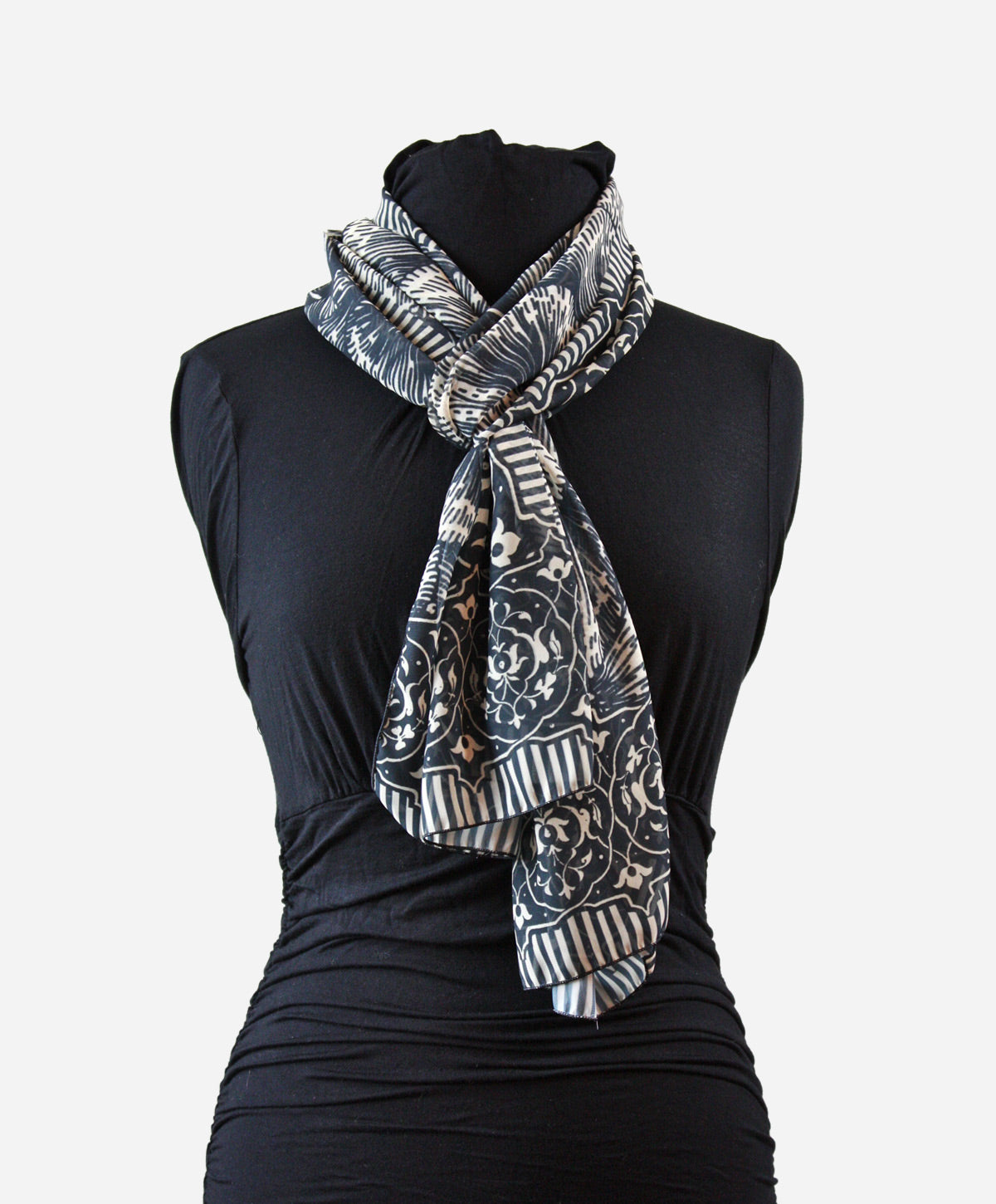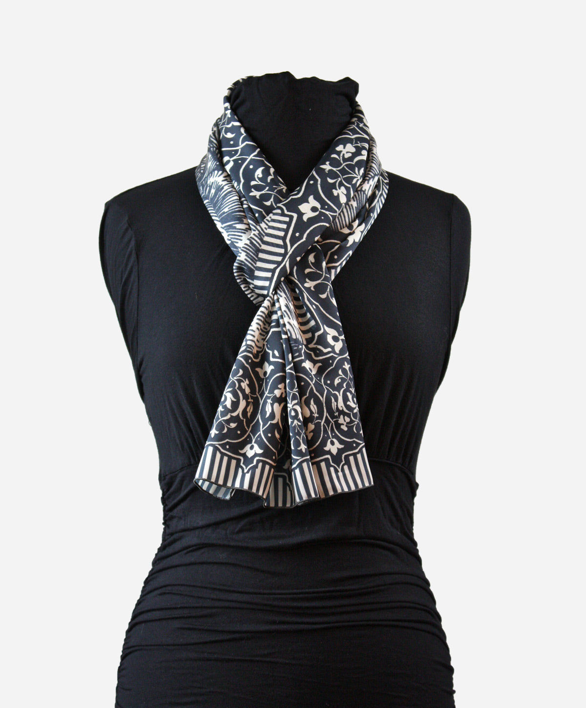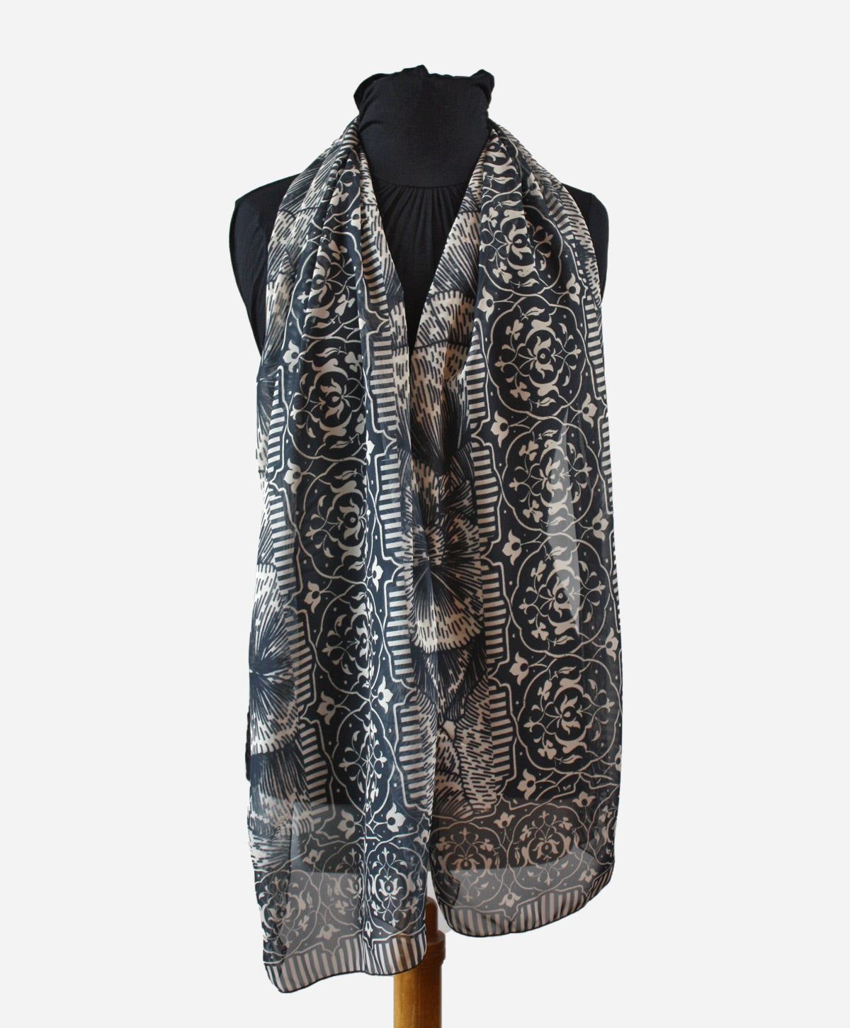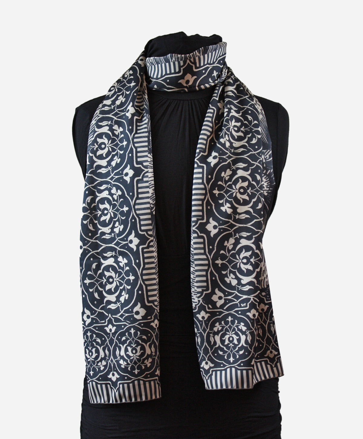 Mythology and history have taken root in this stunning scarf design influenced by ancient craftsmen and tile makers. The abstracted floral patterns and deep, rich dark blues, greys and cream colours in this scarf will add instant elegance to any outfit. Dimensions are 16”X72” so this scarf is versatile enough to be worn in any number of traditional ways, or simply draped over your shoulders like a shawl or wrap.