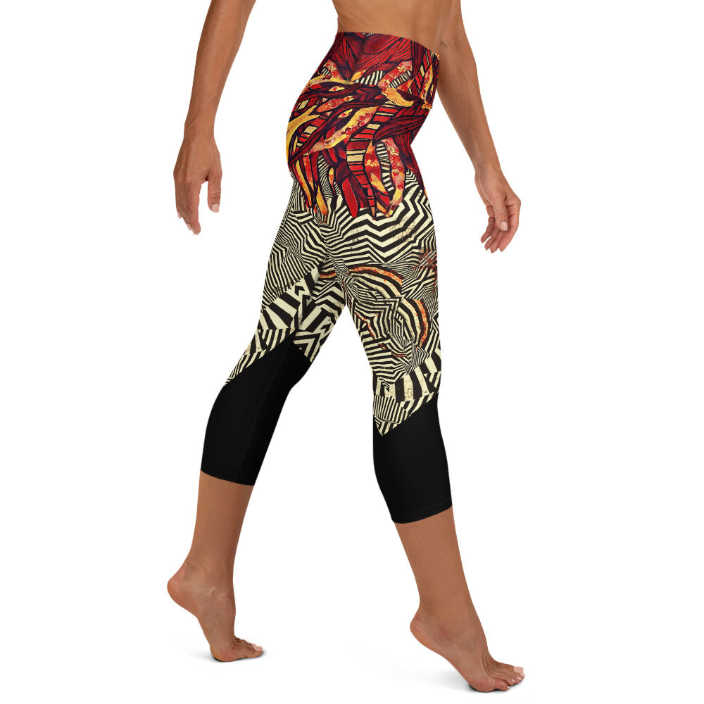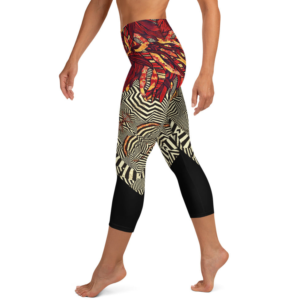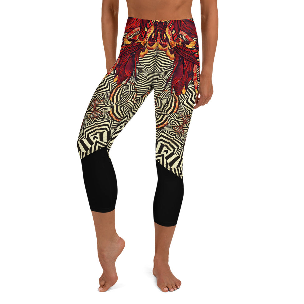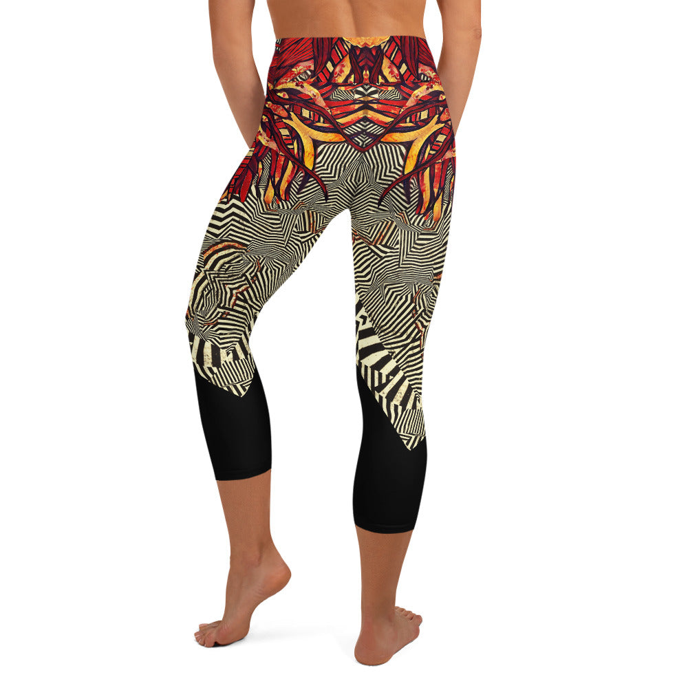 Stylish, edgy and unique! Black and white geometrics are the perfect backdrop to the colourful floral and fiery designs featured on these leggings. These leggings give freedom to your creativity and yoga practice! Printed leggings pair perfectly with the athletic top or your favourite T-shirt to keep you covered for your workouts, dance routines, or day-to-day style. Fashionable enough to pair with your favourite top for a night on the town, and comfortable enough for just lounging on the couch!