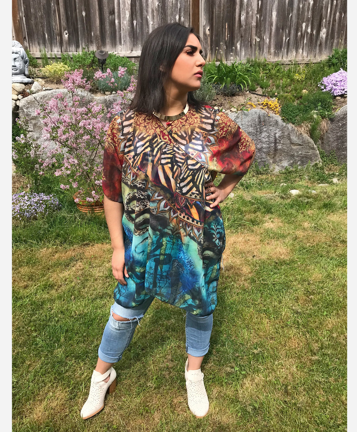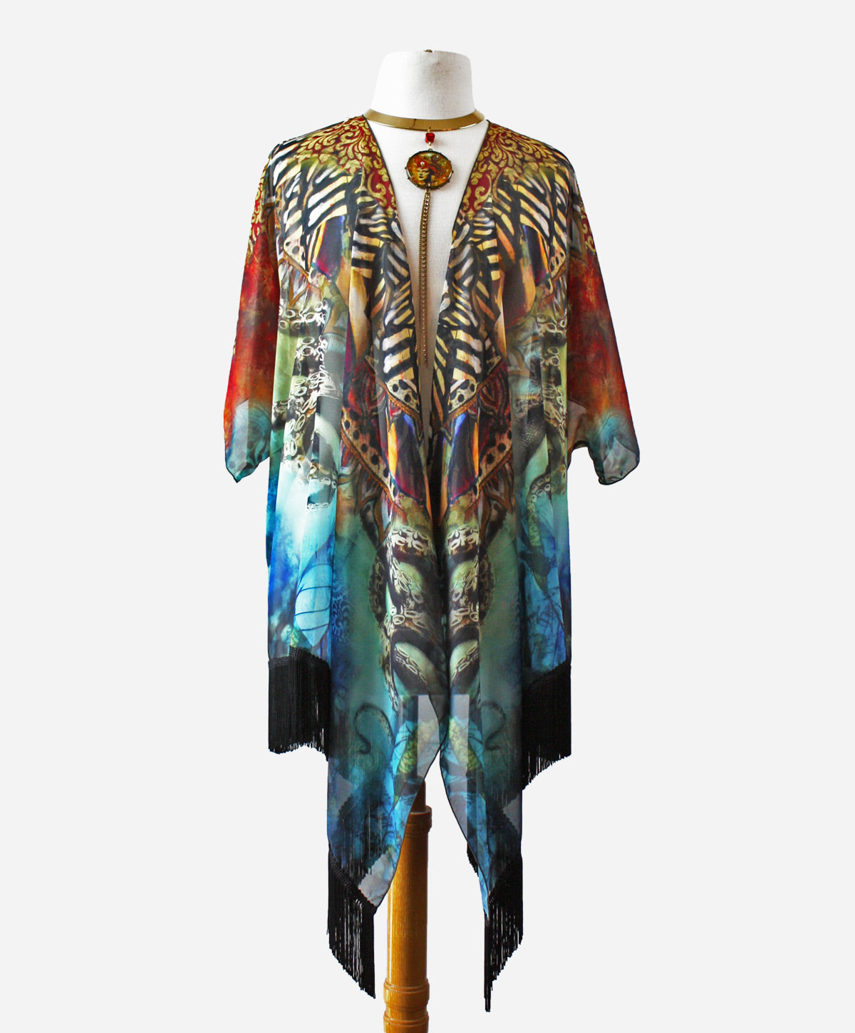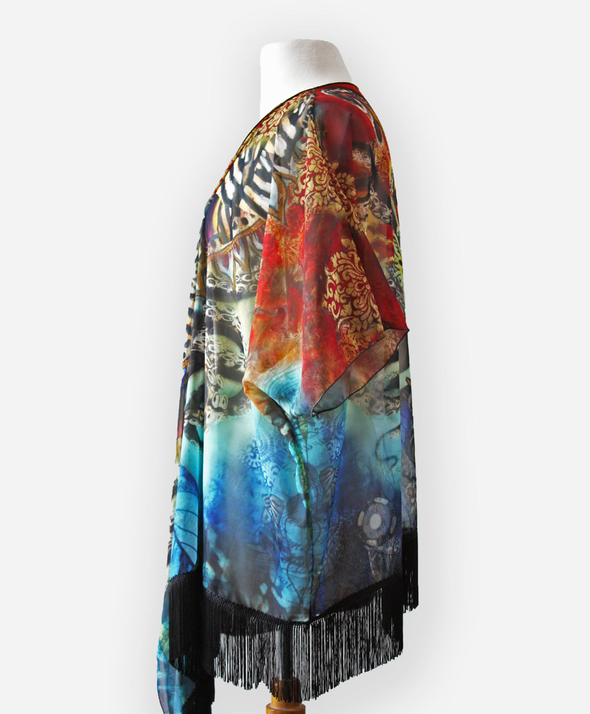 This draped kimono is designed from one of my large scale mixed media artworks called Seadusa - a reinterpretation of the tale of Medusa. Inspired by the modern kimono and designed to be flattering on a variety of body types. Loose fitting and flowy it works beautifully thrown over a plain shirt or t-shirt to add instant glamour to any outfit. Absolutely perfect for those times you would like your shoulders covered in those sleeveless tops or dresses. Generous cut, shorter in the back with flowing tendrils of chiffon in the front, this kimono can easily be worn belted or tied in the front to vary the look. This is truly the perfect item to take with you on your travels.