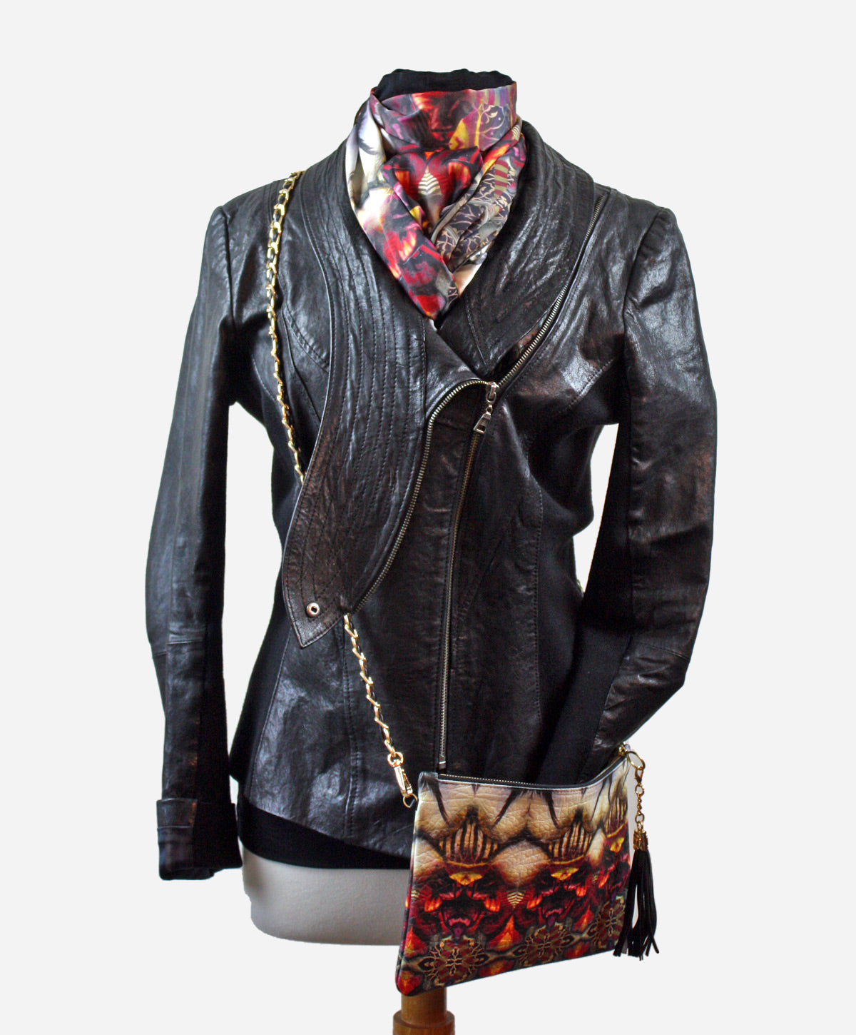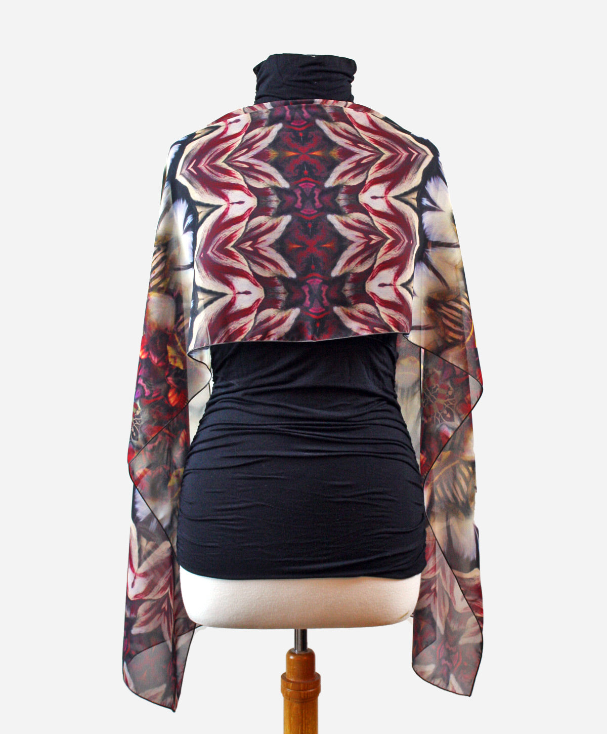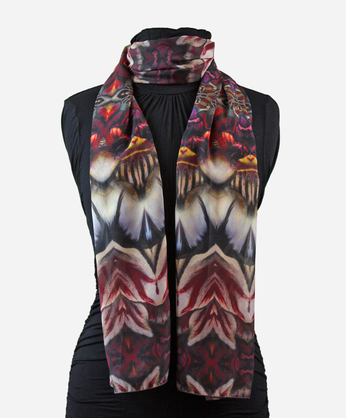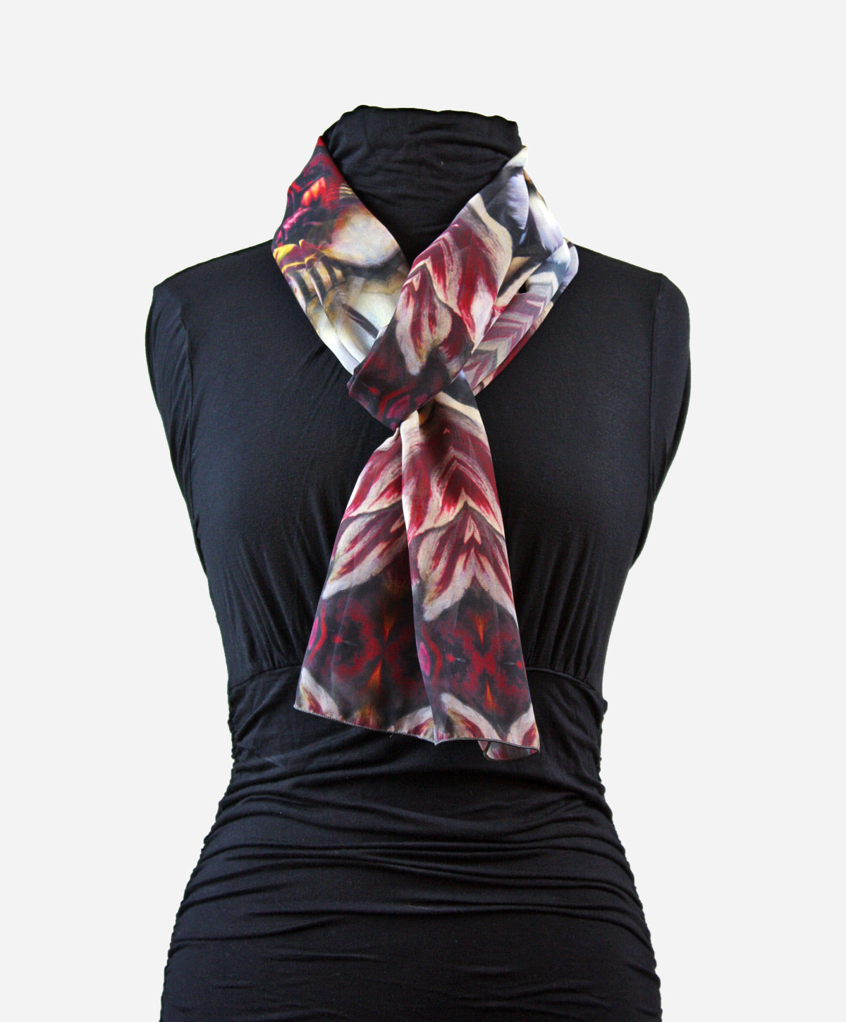 Effortless glamour, with the abstracted tulip patterns and deep, rich colours in this scarf you'll be turning heads wherever you go. Dimensions are 16”X72” so this scarf is versatile enough to be worn in any number of traditional ways, or simply draped over your shoulders like a shawl or sheer wrap.