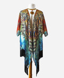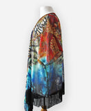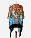 This draped kimono is designed from one of my large scale mixed media artworks called Seadusa - a reinterpretation of the tale of Medusa. Inspired by the modern kimono and designed to be flattering on a variety of body types. Loose fitting and flowy it works beautifully thrown over a plain shirt or t-shirt to add instant glamour to any outfit. Absolutely perfect for those times you would like your shoulders covered in those sleeveless tops or dresses. Generous cut, shorter in the back with flowing tendrils of chiffon in the front, this kimono can easily be worn belted or tied in the front to vary the look. This is truly the perfect item to take with you on your travels.