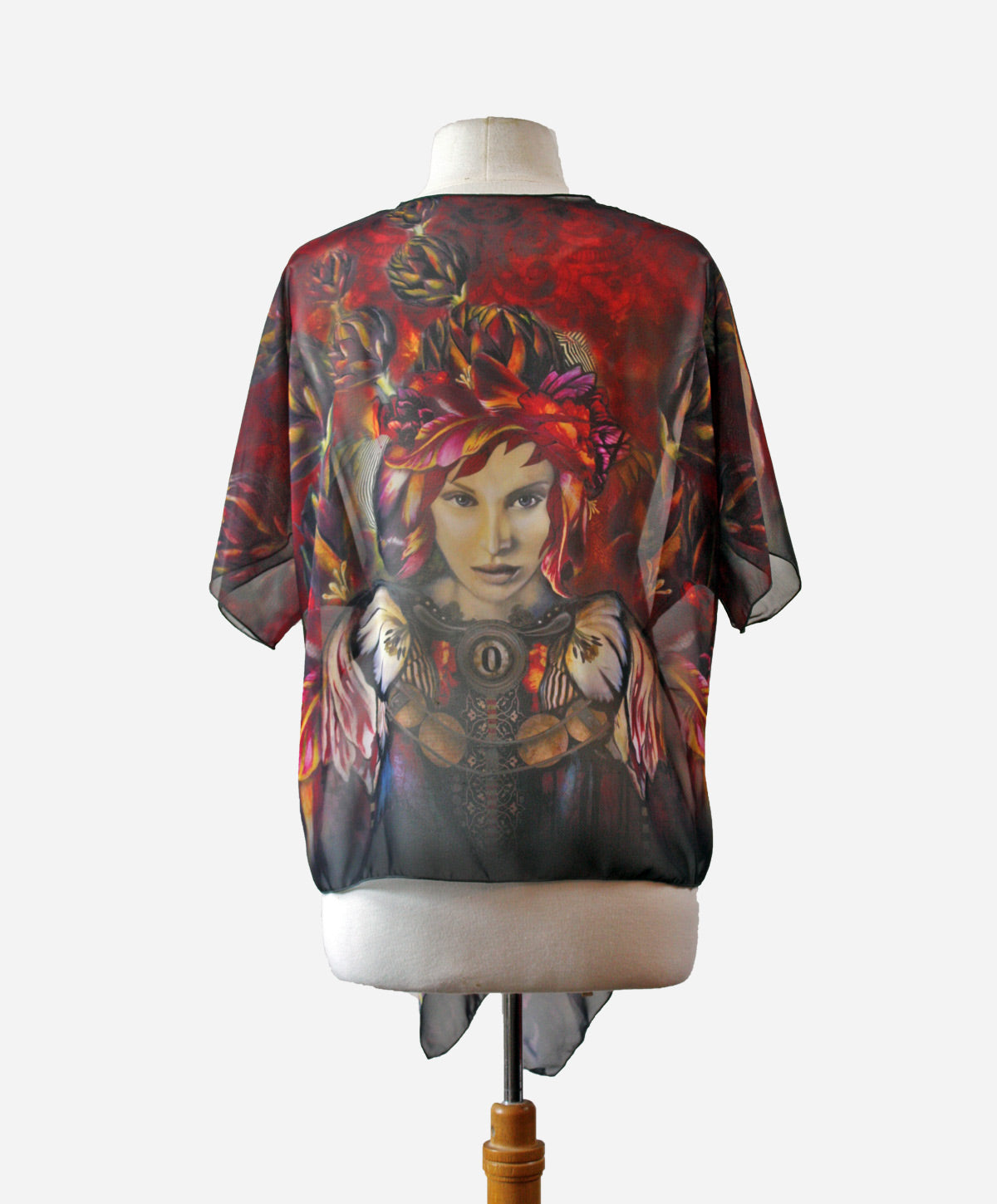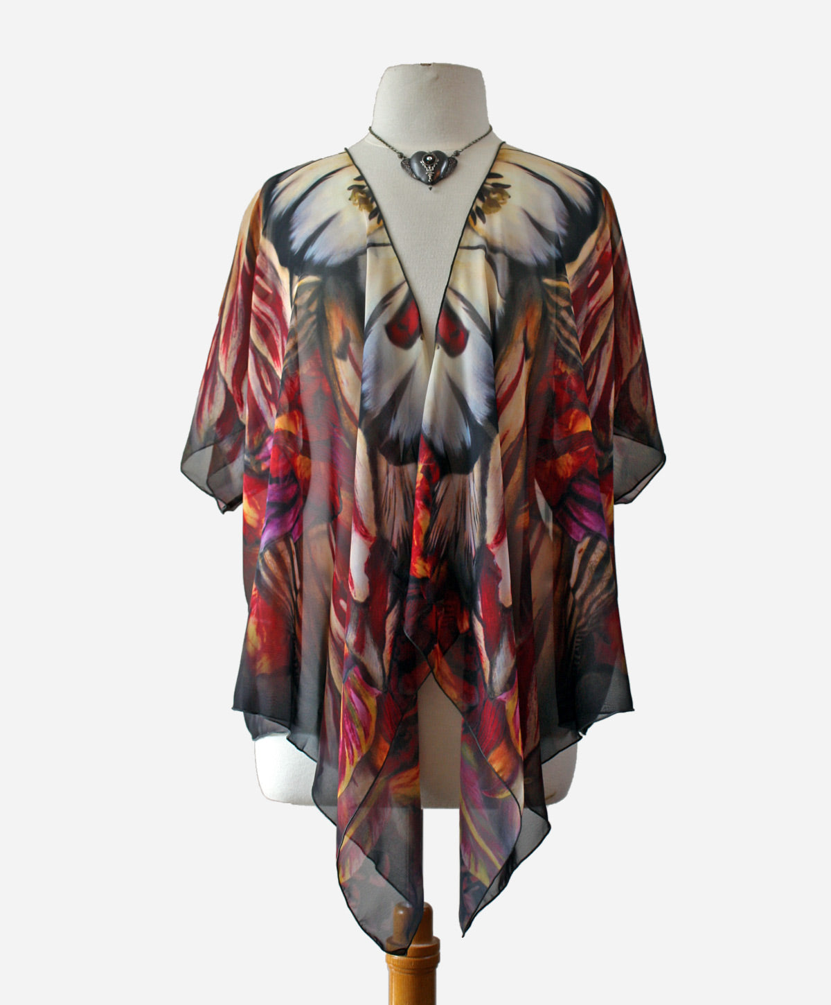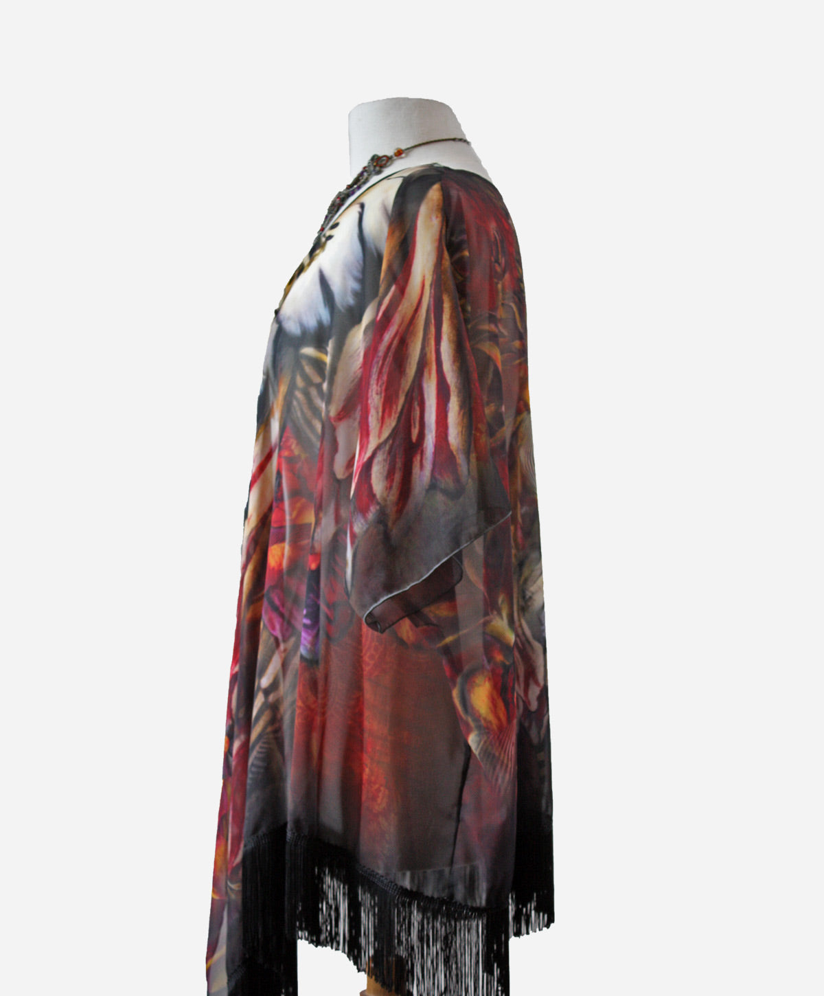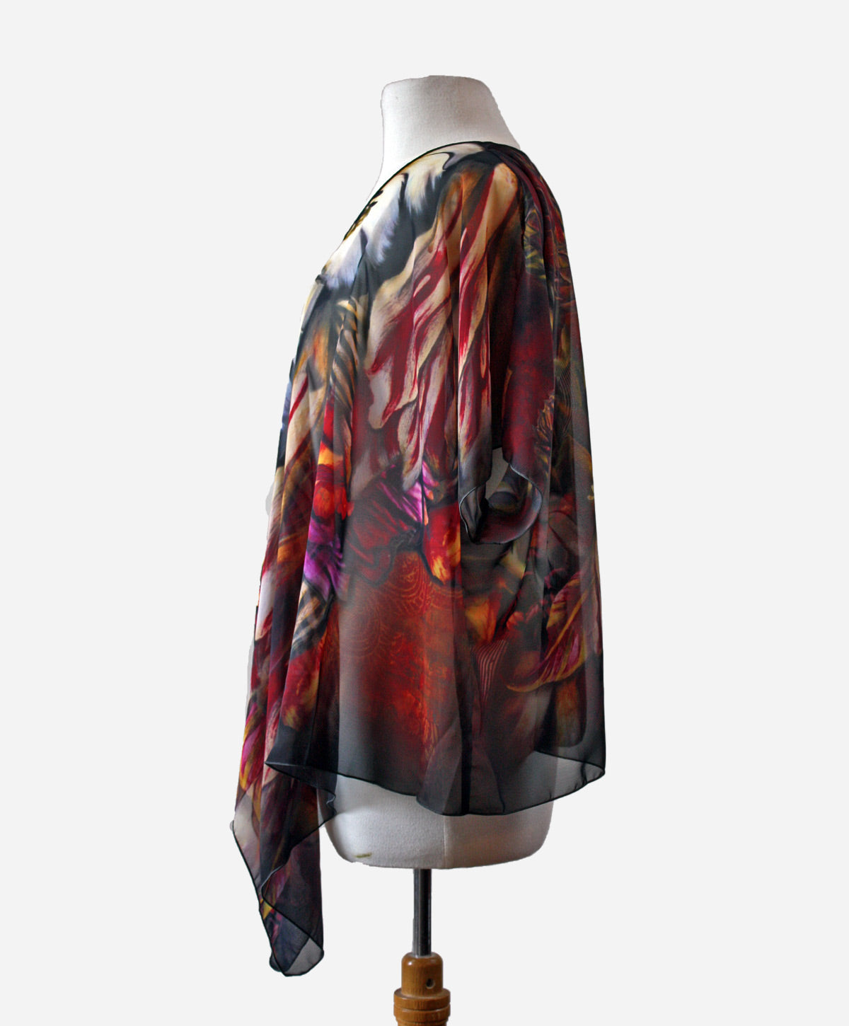 Unique one-of-a-kind wearable art. This draped wrap is designed from one of my large scale mixed media artworks called the Fool (based on the Tarot) and she represents bold new beginnings and a leap of faith (seemed an appropriate piece to launch this wearable art collection). Inspired by the modern kimono and designed to be flattering on a variety of body types. Loose fitting and flowy it works beautifully thrown over a plain shirt or t-shirt to add instant glamour to any outfit. Absolutely perfect for those times you would like your shoulders covered in those sleeveless tops or dresses. Generous cut, shorter in the back with flowing tendrils of chiffon in the front, this kimono can easily be worn belted or tied in the front to vary the look. This is truly the perfect item to take with you on your travels.