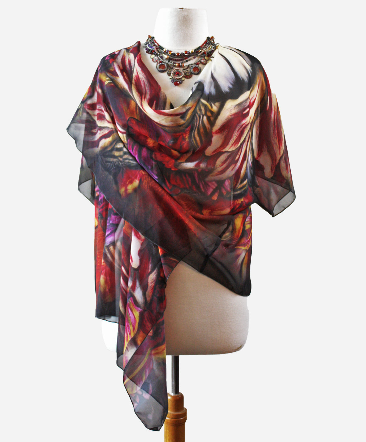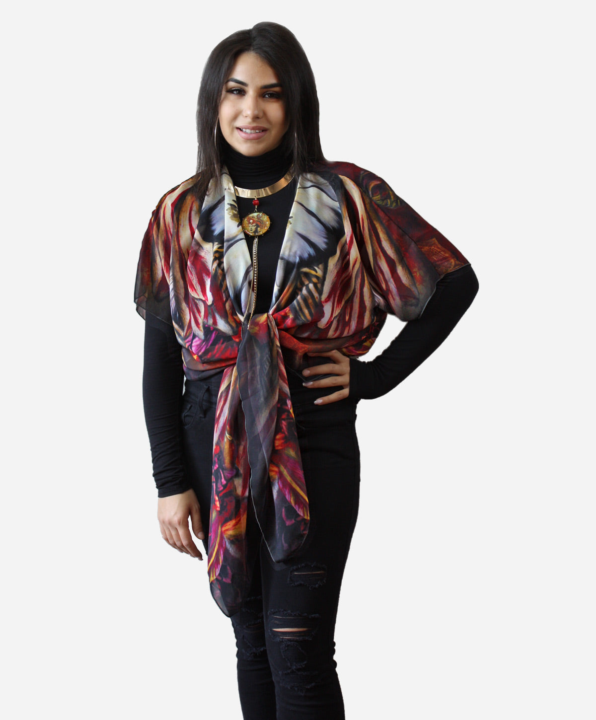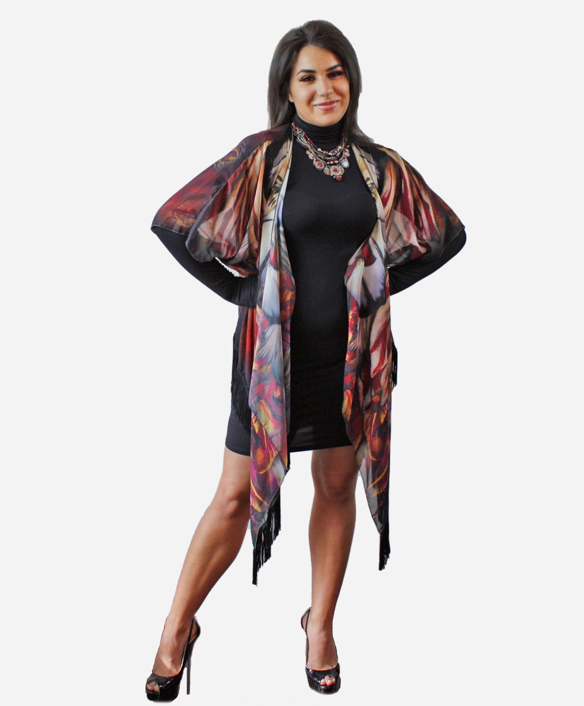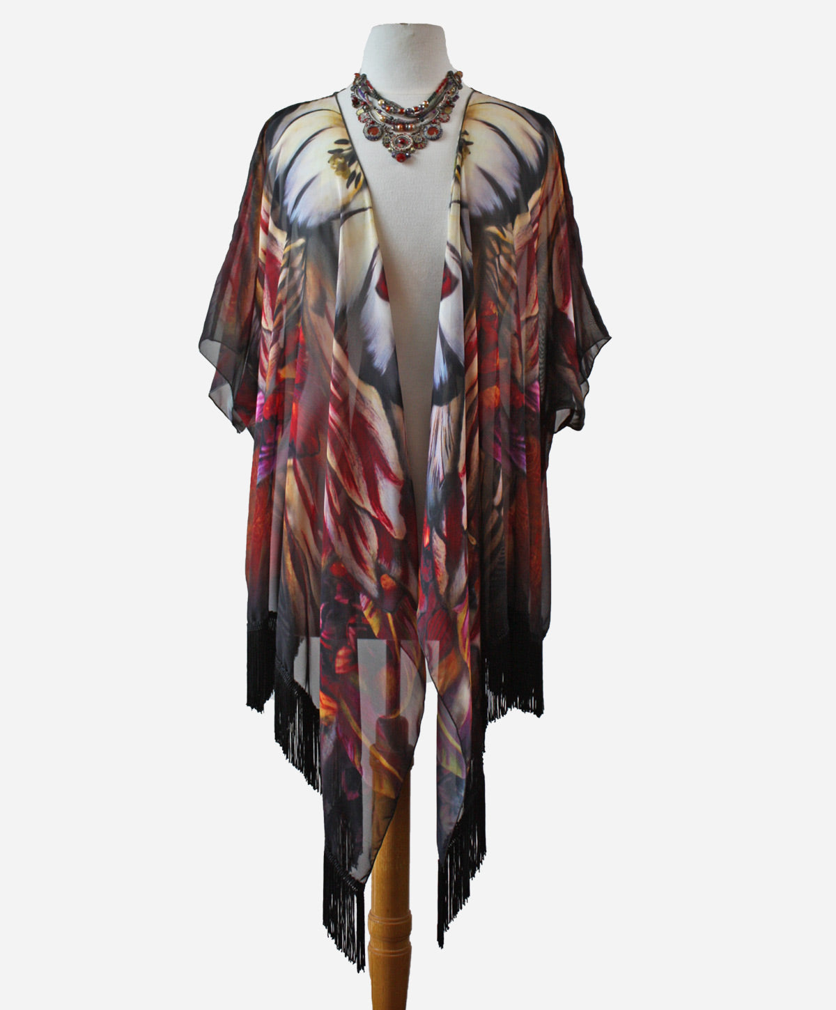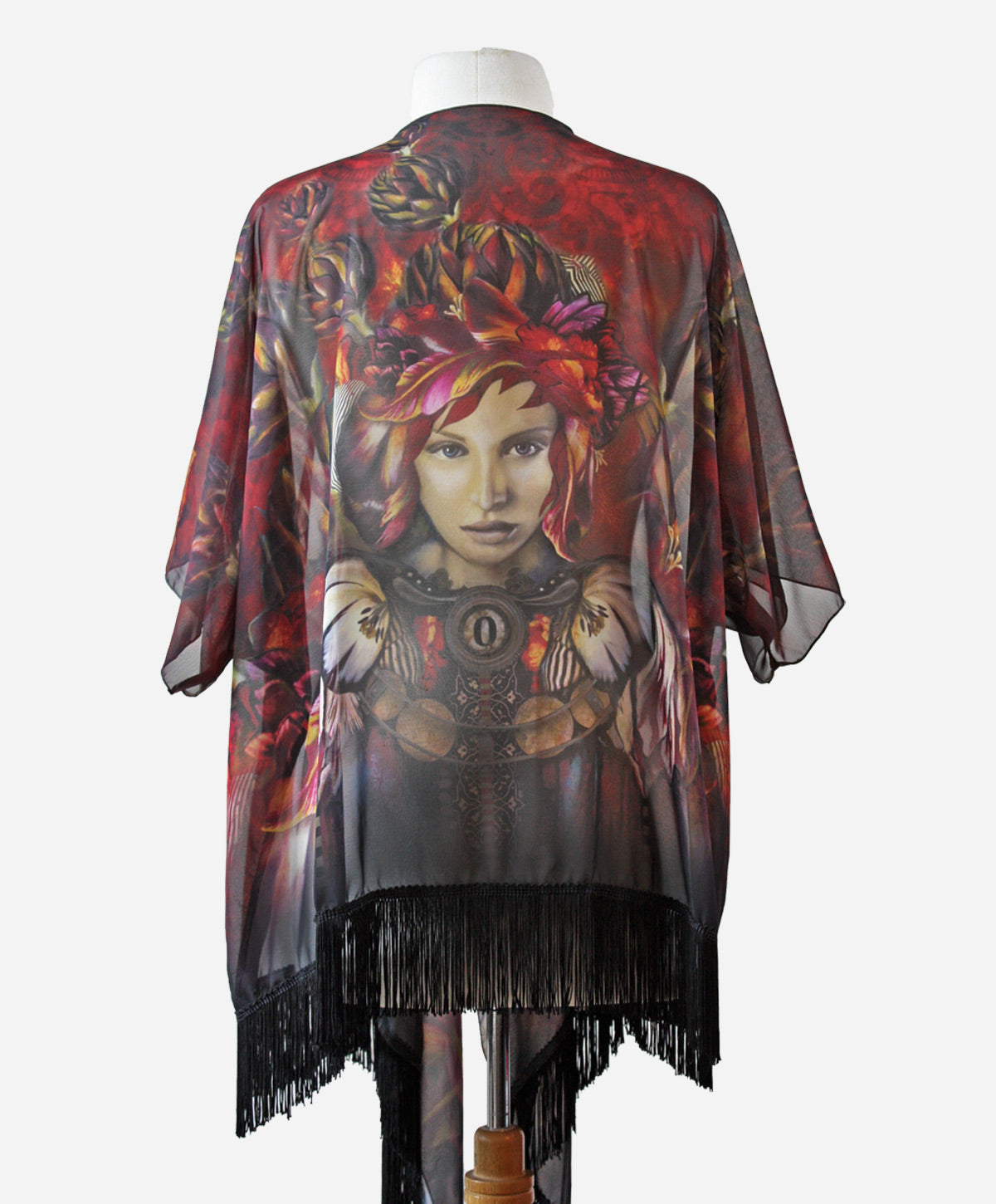 Unique one-of-a-kind wearable art. This draped wrap is designed from one of my large scale mixed media artworks called the Fool (based on the Tarot) and she represents bold new beginnings and a leap of faith (seemed an appropriate piece to launch this wearable art collection). Inspired by the modern kimono and designed to be flattering on a variety of body types. Loose fitting and flowy it works beautifully thrown over a plain shirt or t-shirt to add instant glamour to any outfit. Absolutely perfect for those times you would like your shoulders covered in those sleeveless tops or dresses. Generous cut, shorter in the back with flowing tendrils of chiffon in the front, this kimono can easily be worn belted or tied in the front to vary the look. This is truly the perfect item to take with you on your travels.