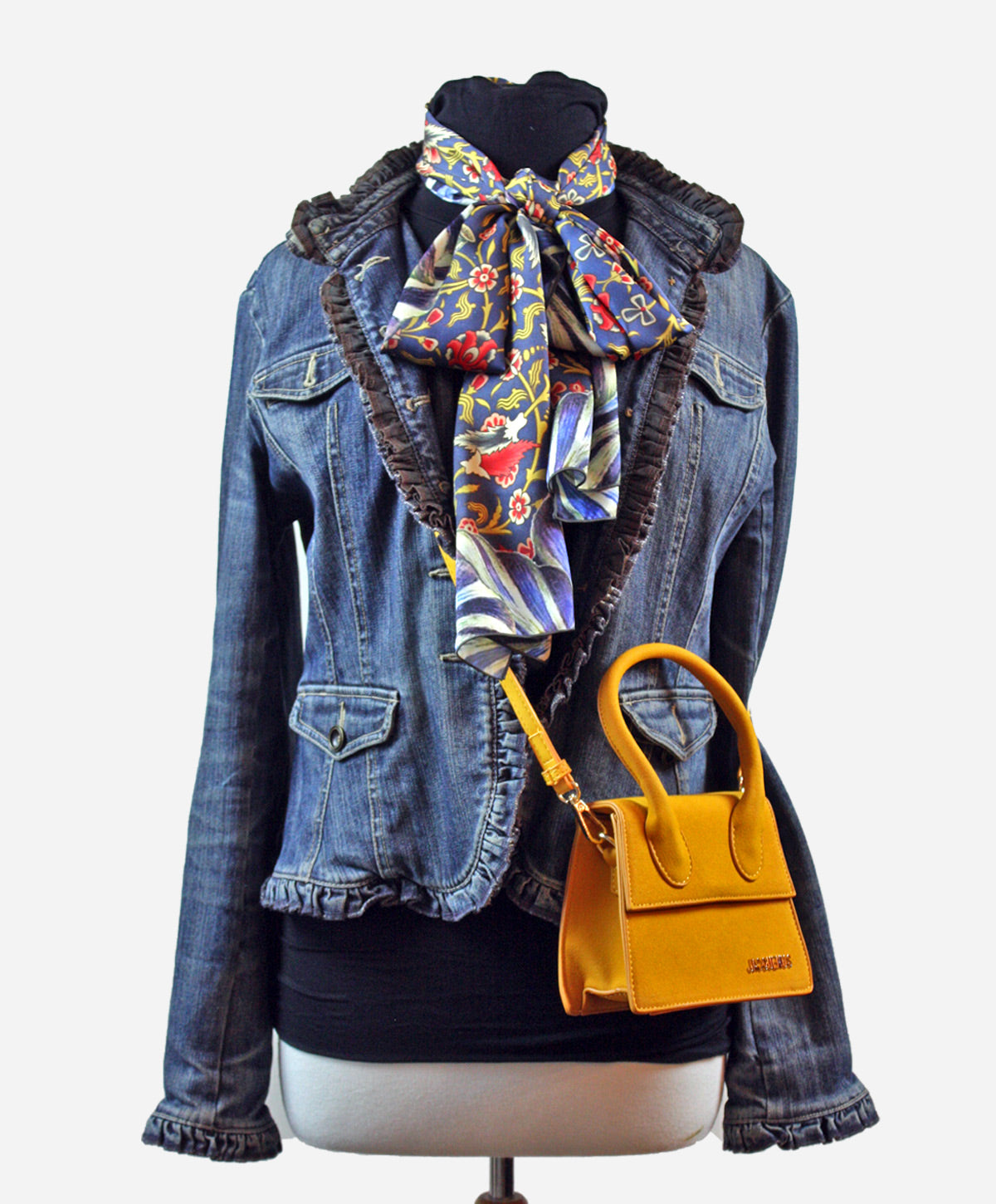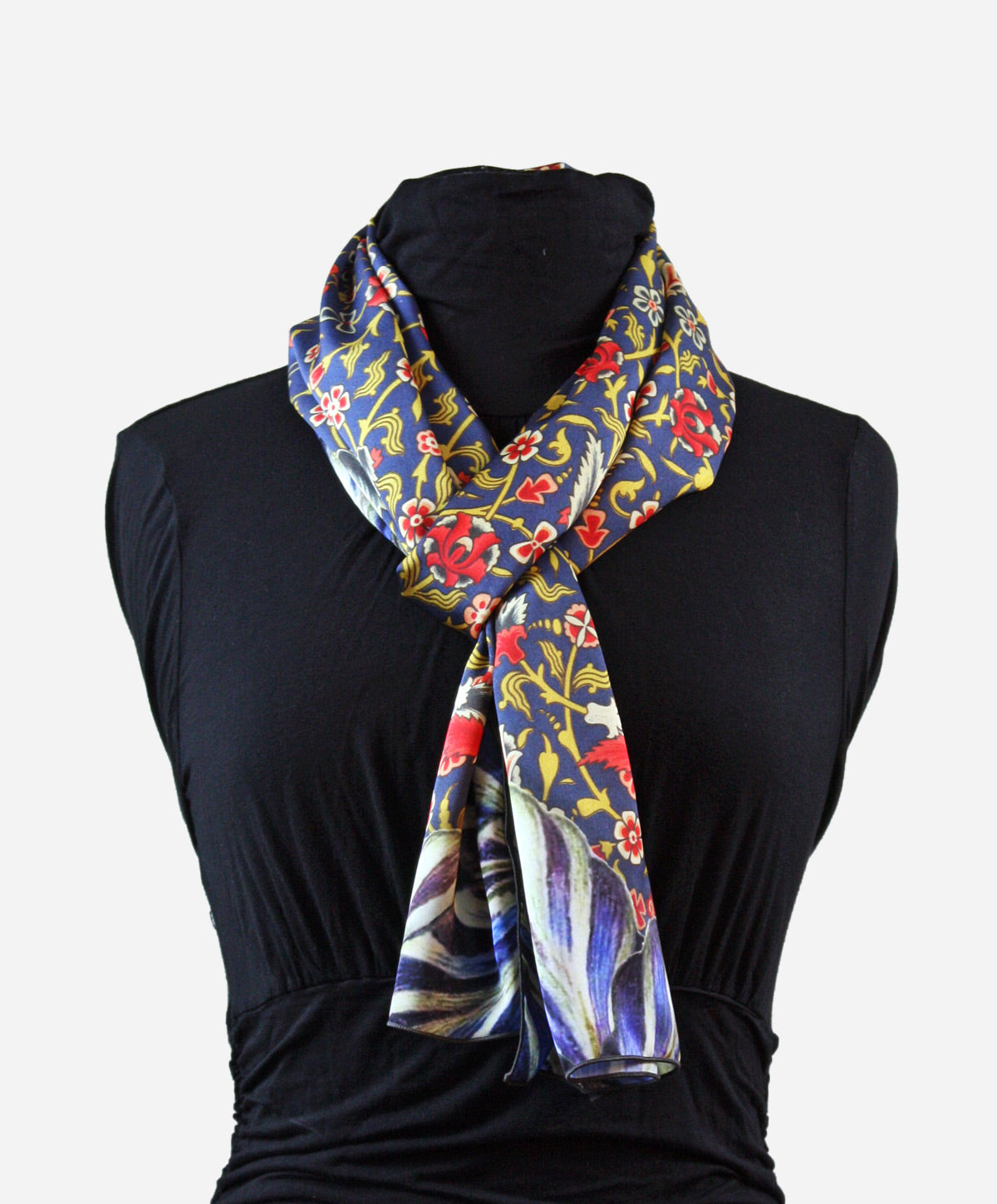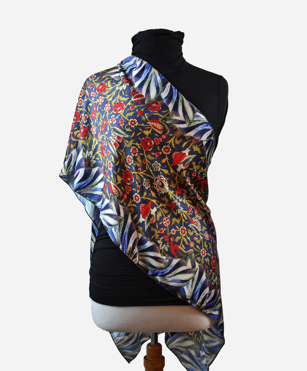 Exuberant and colouful, the mythology behind this artistic scarf is an homage to the Mongolian and Turkish Earth Goddess Etugen. The strong floral patterns and vibrancy of this unique scarf will add interest and glamour to any outfit. Dimensions are 16”X72” so this scarf is versatile enough to be worn in any number of traditional ways, or simply draped over your shoulders like a shrug or wrap.