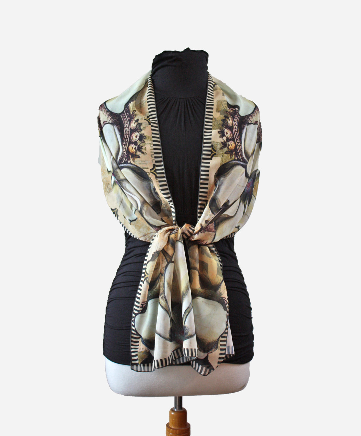 Magnolias have long been associated with divine beauty, life and joy, and now you can wrap yourself up in this floral revelry. A striped border keeps the design feeling modern, while the delicate patterns and subtle colours of this scarf will allow it to be easily paired with almost anything in your wardrobe. Dimensions are 16”X72” so this scarf is versatile enough to be worn in any number of traditional ways, or simply draped over your shoulders like a shrug or sheer wrap. Would make a beautiful and unique gift for a bride or bridesmaids.
