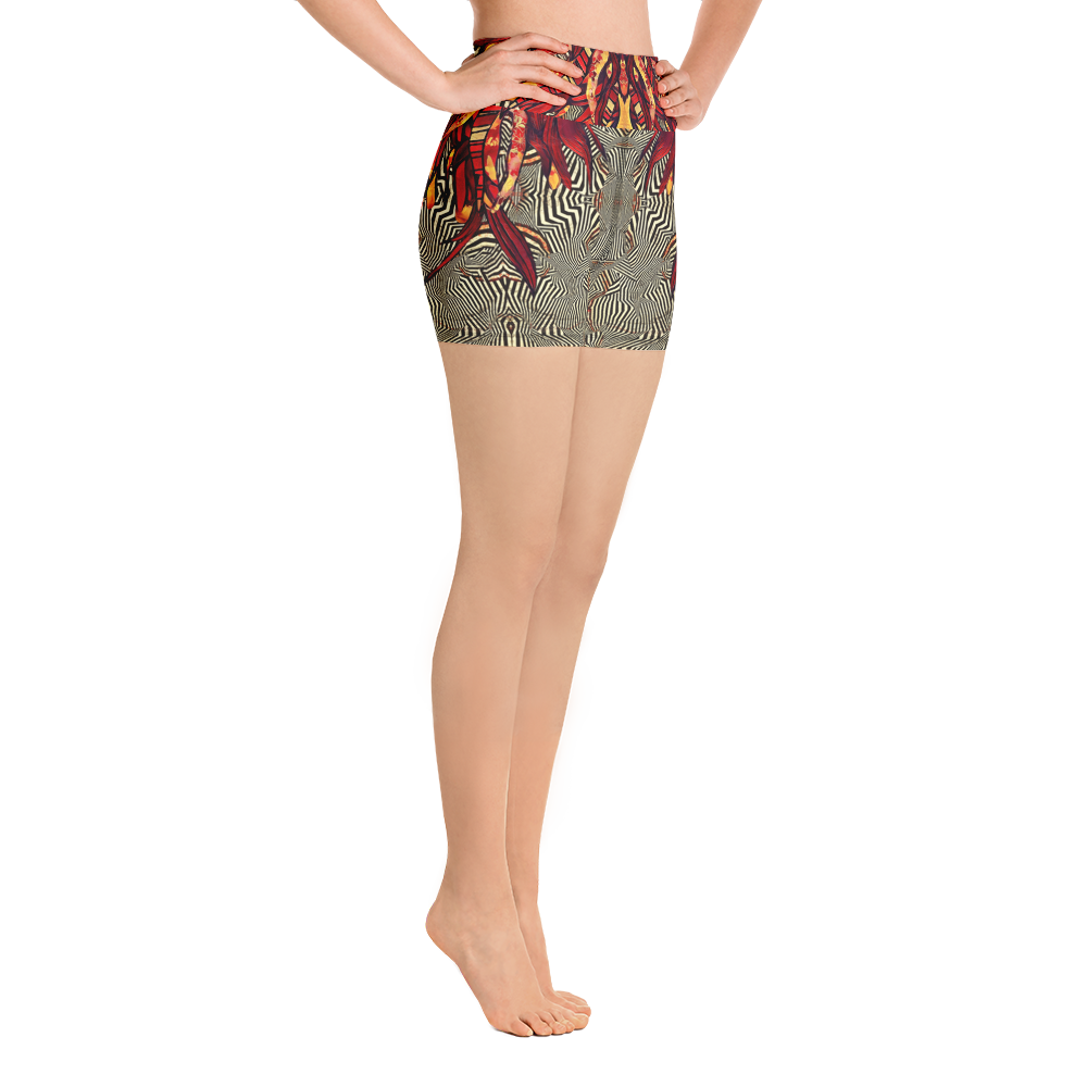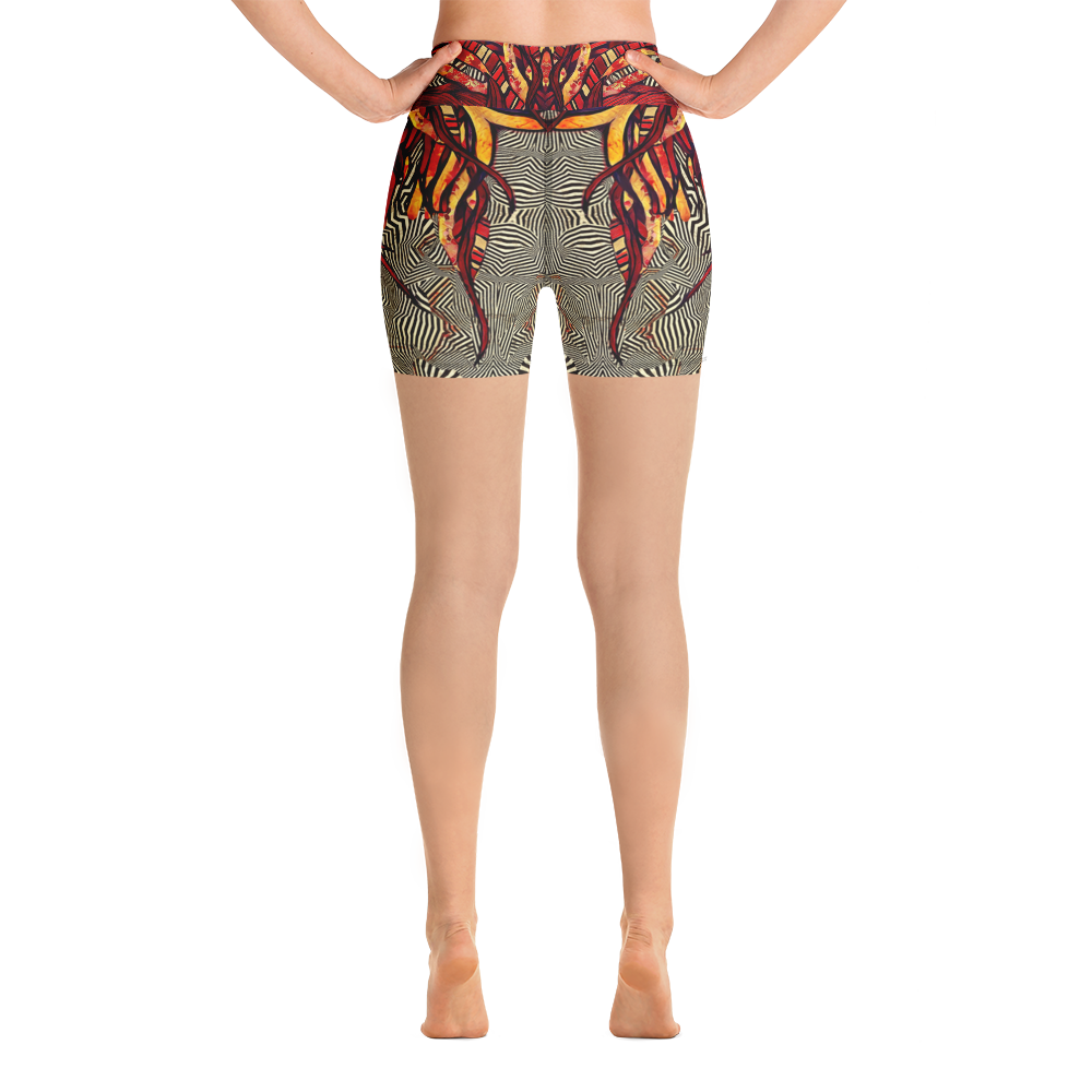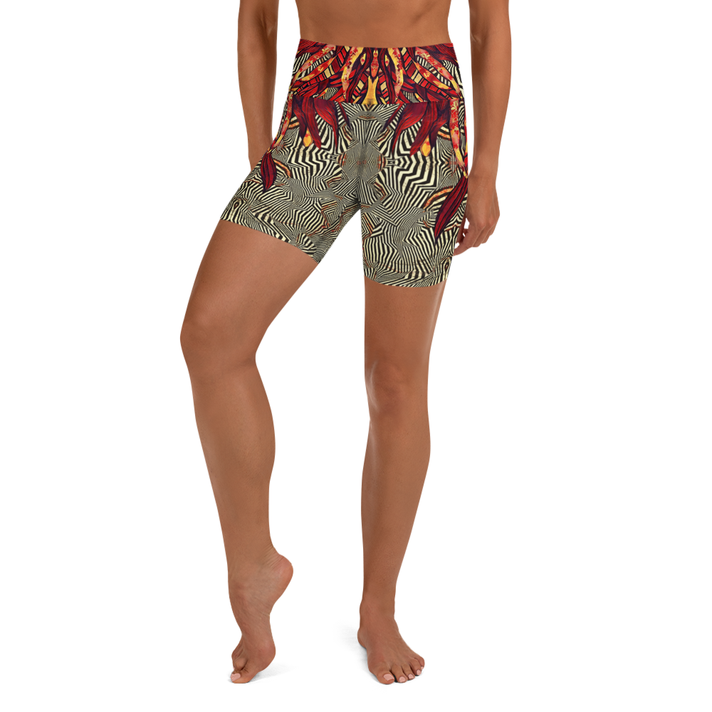 Yoga athletic shorts, mid-thigh length in vibrant print featuring abstracted flowers, flame-like graphics and zig-zaggy black and off-white stripes. Designed by artist Andrea Matus.